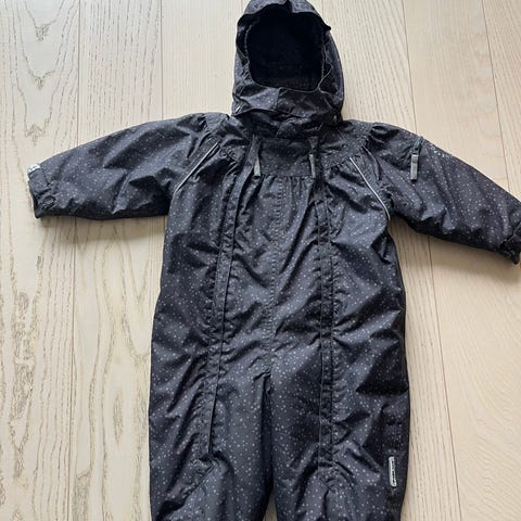 Flyverdragt, Flyverdragt, POMPDeLUX, str. 80, Lækker flyverdragt og luffer (str. XS) fra POMPdeLUX i mørkegrå, brugt meget lidt. Flyverdragten har aftagelig hætte, dobbelt lynlås, vindfang ved hænder og fødder og vandsøjletryk på 10.000mm.