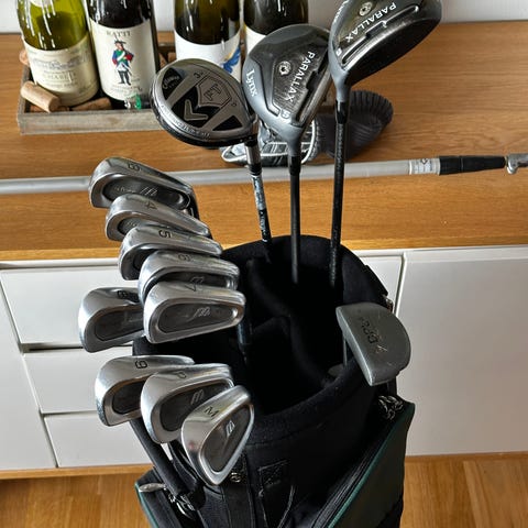 Alt right-handed, standard længder. Brugt, men i fin stand – hovederne er rene og grips er OK.