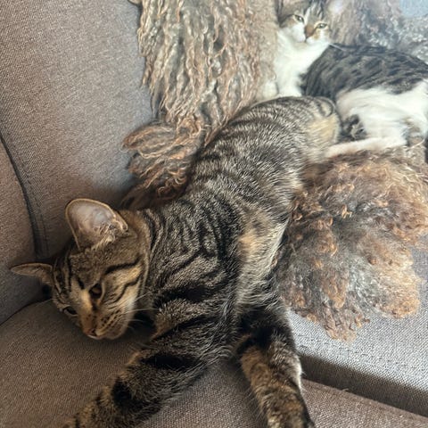 Note: De skal have nye kradsetræer og kattebakker, da deres nuværende har set bedre dage. Vi sender dog gerne noget af deres legetøj, transportkasser, tæpper og plejeredskaber med, så de har velkendte dufte i deres nye hjem. Derudover giver vi også det foder og kattegrus med, som vi har tilbage på tidspunktet for adoptionen, da det er vigtigt, at de bliver vænnet gradvist til nyt foder, hvis man ønsker at skifte.