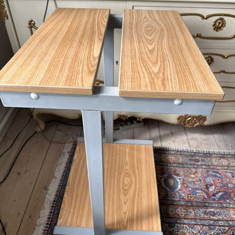 Lille computerbord på hjul med plads til det hele, 2 udtrækshylder til både keyboard og printer inklusiv lampe og papirholder