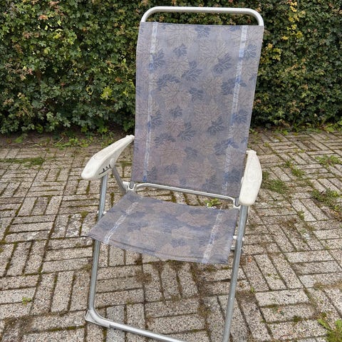 Sammenklappelig havestol med gråt stribet stof. Perfekt til camping, haven eller altanen. Fremstå pæne og velholdte med enkelte brugsspor. Stel i alu og stof og polstring i nylon. Tørre lynhurtigt. Sælges samlet.