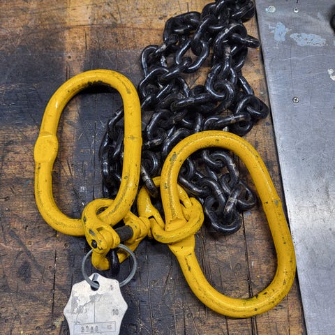 Kædesling 2-part løftekæde med kroge. Kæden er forsynet med to store sikkerhedskroge i den ene ende og samlingsled/ophæng i den anden ende. Ifølge mærkepladen er den maksimale belastning 6700 kg ved 45° og 4750 kg ved 60°. Velegnet til løft og surring af tunge emner, hvor der kræves kædesling med kendt arbejdslastgrænse.