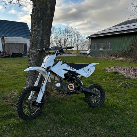Dirtbike motorcykel i sort og blå med knopdæk og affjedring til kørsel i terræn. Modellen har høj siddestilling, brede styr og skivebremser for og bag.