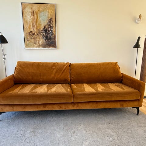 Velour sofa. Meget komfortabel. Lidt brugsspor bagpå. Ingen farveforskelle. Det er lyset der snyder lidt på fotoet.