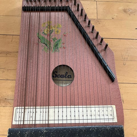 Musima Markneukirchen citer i sort finish. Instrumentet har flere rækker strenge og to lydhuller på oversiden. Dekoreret med blomstermotiv omkring strenge og lydhuller.