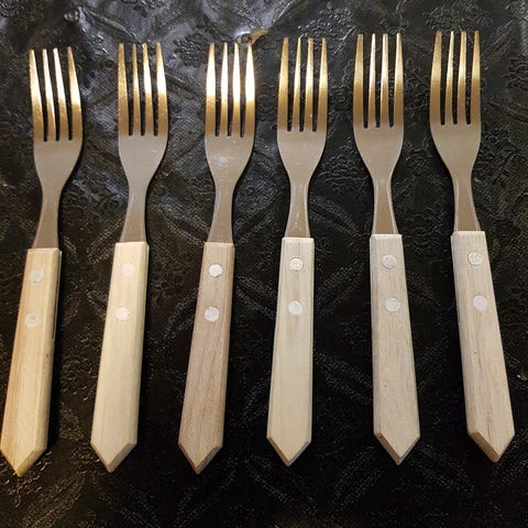 Andet, Bestik, Nicklebronze, Bronze, Velholdte bestikdele: 12 spiseskeer l: 19,5 cm. 10 gafler l: 14,5 cm, 11 teskeer l: 11 cm, 12 små knive l: 14,5 cm , 2 skeer l: 17 cm. serveringsgafler l: 18,8 cm og 15 cm. Samlet pris 850 kr. kan sende efter aftale