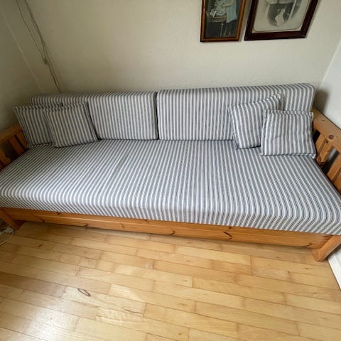 Dansk designer sovesofa med opbevaring i grå tekstil. Sofaen kan slås ud til seng og har en integreret opbevaringsskuffe under liggefladen, egnet til f.eks. sengetøj eller puder. Ryglæn og armlæn er polstrede for støtte, og møblet kan bruges både som siddeplads og som ekstra soveplads i stue, gæsteværelse eller ungdomsværelse. Skal afhentes i Søborg efter aftale. Ring på tlf 53705767 for at aftale nærmere.