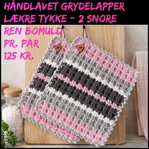 Nystrikkede særdeles tykke og bløde grydelapper uden modstand når man skal gribe