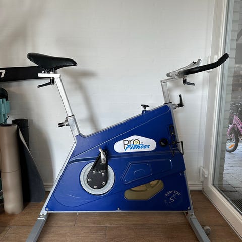 Body Bike motionscykel indendørs spinningcykel i sort. Cyklen har tung svinghjul foran, justerbart sæde og styr samt pedaler med remme. Egnet til indendørs cykeltræning og spinning i hjemmet eller mindre træningsrum.