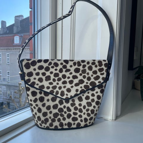 Sort med hvide tegninger. Lækre detaljer med skind og knapper.
