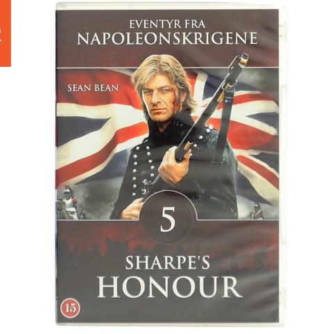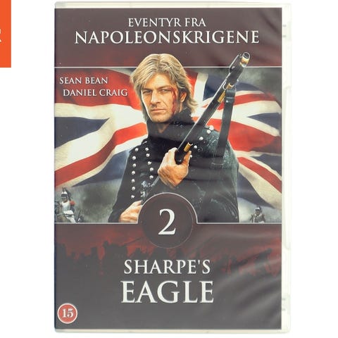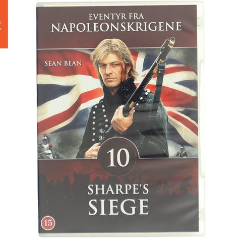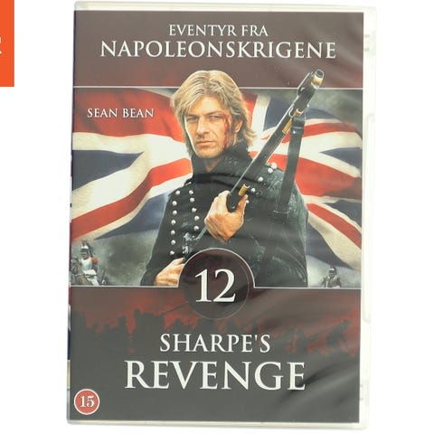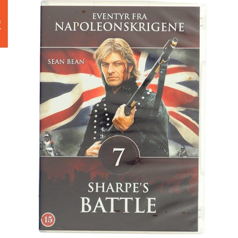 DVD-film med titlen 'Sharpe's Enemy', der er den fjerde i en serie af eventyrfilm baseret på Bernard Cornwells romanserie om den britiske soldat Richard Sharpe under Napoleonskrigene. På forsiden og bagsiden af DVD'en er der billeder og informationer relateret til filmens indhold samt skuespillere, herunder Sean Bean og Elizabeth Hurley. Udgivelsesdatoen og yderligere specifikationer angives også på bagsiden.