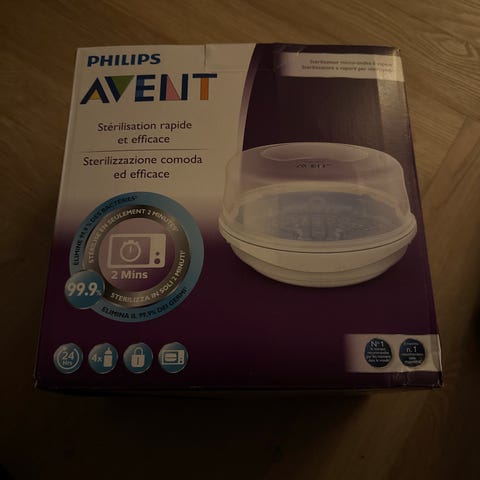 Philips Avent dampsterilisator, designet til at sterilisere babyflasker, sutter og andet tilbehør. Den består af en hvid base og et transparent låg. Sterilisatoren er rund med en diameter på 30 cm og har indvendige rum til flasker. Det gennemsigtige låg gør det let at overvåge processen. Produktet er praktiskt og effektivt til at holde babyudstyr rent og fri for bakterier.