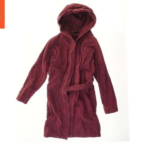 Badekåbe i sort stof med hætte og bælte til lukning. Den har et enkelt knap foran og dekorationer på ærmet.