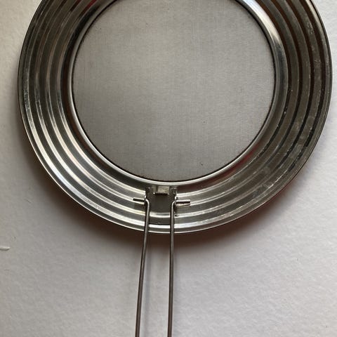 Billederne viser et rundt metal låg, der sandsynligvis er beregnet til at dække en gryde. Den har en diameter på 22 cm. Låget har en central knop til håndtering og er lavet af et rustfrit metalmateriale, der giver det et skinnende udseende. Der er synlige tegn på brug og lidt patina på overfladen. Tags: låg, køkken, metal, gryde