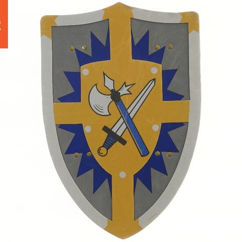 Dette er et børneskjold, der måler 34x45 cm. Det har et blåt og gyldent design med et stiliseret billede af en løve i midten. Skjoldet er lavet af letvægtsmateriale, hvilket gør det nemt for børn at håndtere. Bagsiden har to sorte stropper til fastgørelse.
