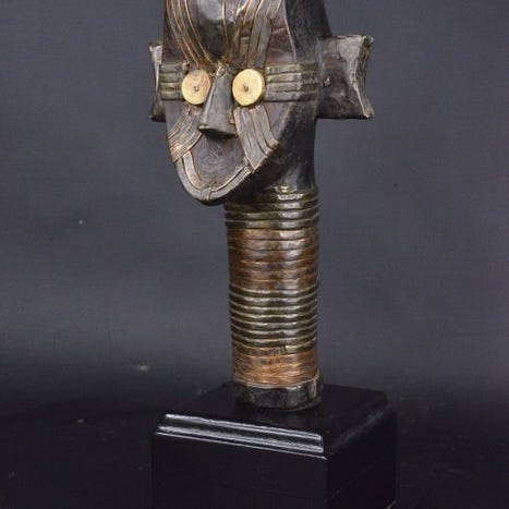 Fang Tête reliquaire, træhoved fra Gabon med glasøjne, 430 mm høj, 90 mm bred, 120 mm dyb. Klik på den blå "gå til varen" knap, for at købe eller byde på denne vare. Den samlede pris vil blive vist inden du afgiver dit bud.