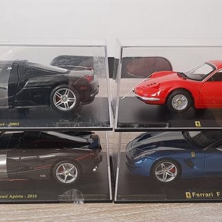 Fire Ferrari 1:24 skala modeller i resin og plastik fra Bburago, nye i farverne gul, grøn og andre farver, inklusiv 599 Hy-kers (2010), F355 Berlinetta (1994), Scuderia Spider 16M (2008) og F12tdf (2015), i originalemballage. Klik på den blå "gå til varen" knap, for at købe eller byde på denne vare. Den samlede pris vil blive vist inden du afgiver dit bud.