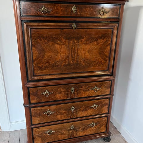 Der tilbydes et højtskabssekretærbord. Et originalt gammeldags eksemplar. Oprindelse fra Frankrig. Årtierne 1960’erne.