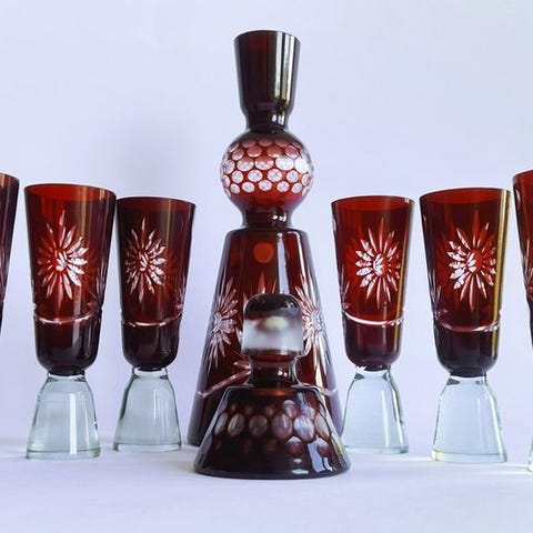 Håndlavet Murano likørsæt i sort glas med kobber aventurin-includeringer, bestående af en 19 cm høj og 10 cm i diameter decanter med prop og seks matchende glas; dateret til 1950–1960, i fremragende stand med mindre brugsspor. Klik på den blå "gå til varen" knap, for at købe eller byde på denne vare. Den samlede pris vil blive vist inden du afgiver dit bud.