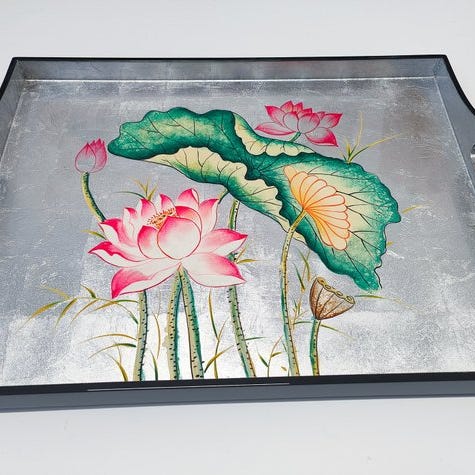 * Kantens og håndtagenes design er udskåret i snitstil med et gittermønster. Baggrunden på bakken har en rødlig og åretegnet finish, der imiterer carey-skal.