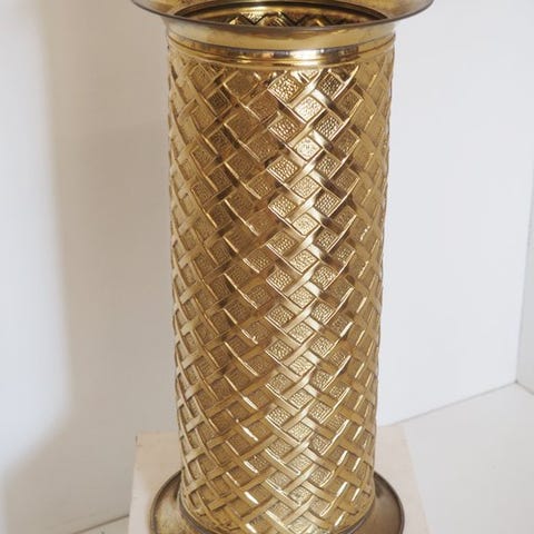 Paraplystativ af messing og kobber fra 1950'erne. Mål: 50 cm højde, 24 cm diameter ved midten, 20 cm høj, 15 cm bund og 1,7 kg i god stand. Afsendt med sporing og hurtig levering.