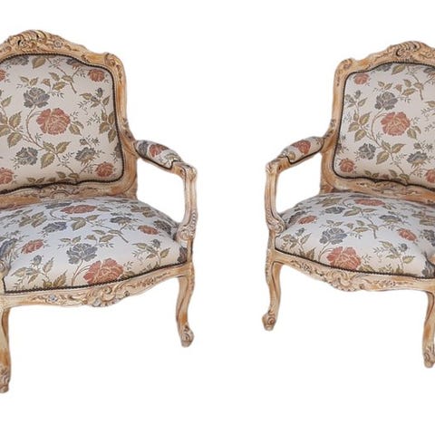 Elegant lænestol i engelsk hvilestil, med et udsøgt stof og et stel og ben af mahogni, helt håndudskåret.