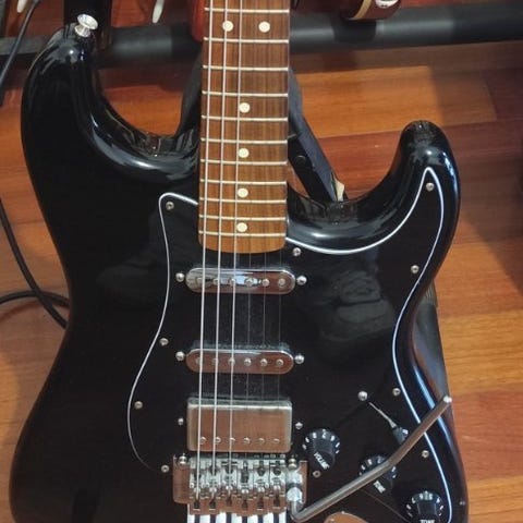 Til salg: særdeles smuk mørk rød/vinfarvet Stratocaster fra mærket Fender Mex med nr. MZ7137080, med ligeledes smuk marmoreret hals. Meget godt klingende pickups, der gengiver Fender-lyden fint. Lille skade på bagsiden, ikke generende. Chrom hardware i top stand og selvfølgelig de originale Fender stemmeskruer. Firevejs-system til flere lydgengivelser, alt sammen med en flot Fender der spiller rigtig glat med lav action og udstyret med nye D'Addario-strenge og leveres med original Fender gigbag.
