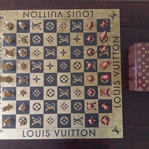 Et i aluminium fremstillet Rolex-sjakbræt med et særegent design. Det er præget af monogrammet Rolex-mønsteret med de sorte Rolex-logoer indarbejdet.