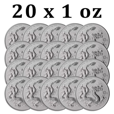 Fem 2025 1 oz ¥10 CNY Kinesiske Sølvdrage mønter i BU-kvalitet, præget af Chinese Mint i Kina, 31,104 g ægte sølv .999, diameter 38 mm, mintage 2.000.000. Klik på den blå "gå til varen" knap, for at købe eller byde på denne vare. Den samlede pris vil blive vist inden du afgiver dit bud.