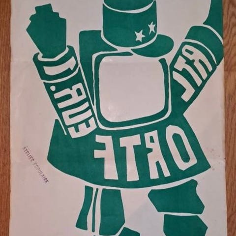 Ægte militærhistorisk stykke, dette skærmpladertryk indeholder et af de mest ikoniske slogans fra den sociale protest i Frankrig.