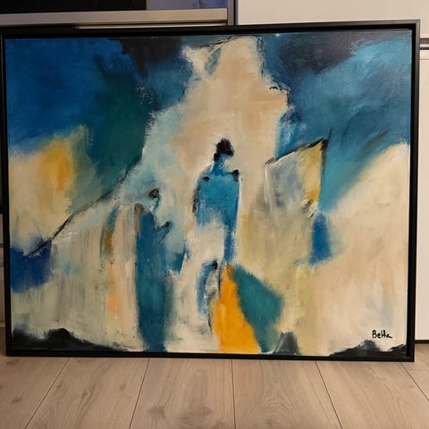 Maleri i rigtig flotte farver 80x80 i ramme 3500.