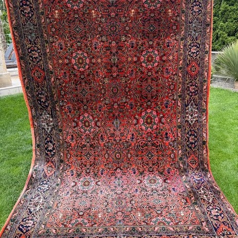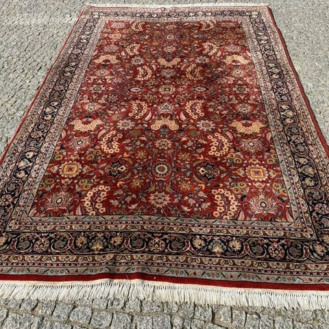 Oprindelsesland Indien, model Top Indo Bidjar, håndvævet tæppe af uld på bomuld, størrelse 345 x 245 cm med frynser, generelt i god stand. Klik på den blå "gå til varen" knap, for at købe eller byde på denne vare. Den samlede pris vil blive vist inden du afgiver dit bud.