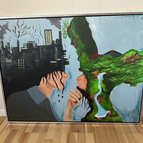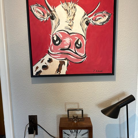 Maleri med køer i flotte farver 100x80 i ramme.