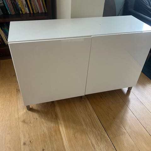 Sælger dette flotte hvide skab med to låger og stilrene net-fronts, som giver et let og moderne udtryk. Perfekt til opbevaring i entré, stue eller soveværelse.
