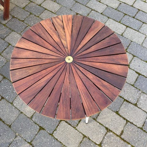 Margurite havebord fra 1960 ca. diameter 100 cm. Begge ben er i dårlig stand og kan ikke bruges. Bordpladen kan med fordel slibes og olieres. Afhentes i Frederikssund