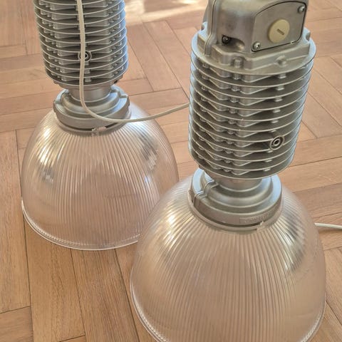 Gunshot grey, ægte industrielle lamper t alm 220 v. Smukt diffust lys m glasskærm nederst. Pris pr stk