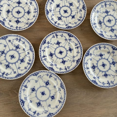 11 middagstallerkner og 11 frokosttallerkner. Royal Copenhagen tallerkener i mørk blå farve. Tallerkenerne har rillet kant og ensfarvet glasur. Egnet som middagstallerkener eller serveringsfade i køkken og spisestue. Velegnet til daglig brug eller som en del af et stel fra Royal Copenhagen.