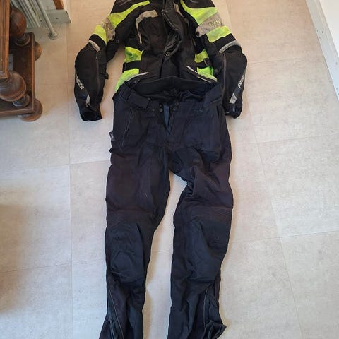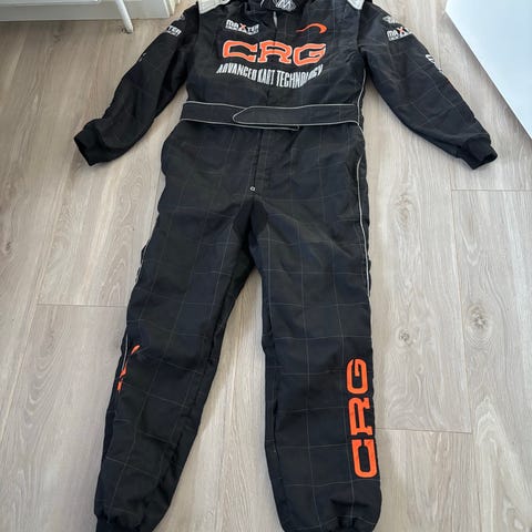 Flammehæmmende køredragt, markeret som str 56/L. Skuldermål ca 52cm, men med stræk over skulderen. Indvendig benlængde ca 82cm.