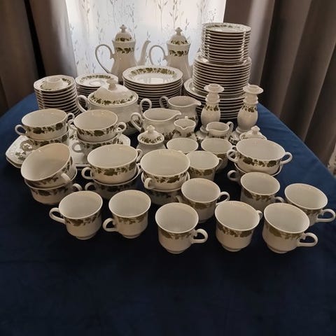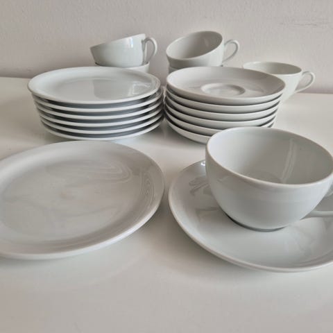 4 krus, flødekande og sukkerskål.