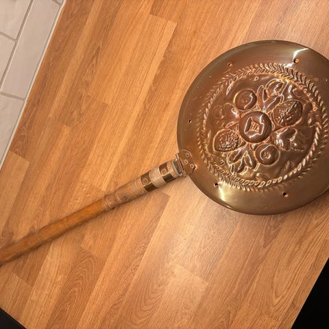 Varmeseng i kobber med langt træhåndtag. Låget er udført i hamret kobber med enkel dekoration, og håndtaget er drejet træ med metalbeslag ved overgangen til selve varmesengen. Egnet som traditionel varmeseng til brug med gløder eller som dekorativ genstand i indretningen. Mål og producent er ikke angivet.