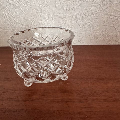 krystal glas skål med låg i klar glas. Skålen har facetslebet mønster og tilhørende låg med greb. Egnet til opbevaring af småting som slik, nødder eller smykker og som dekorativt element i stue, køkken eller på spisebord. Ukendt mærke