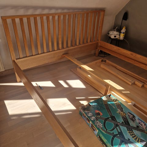 Træseng med lamelbund og madrasser.