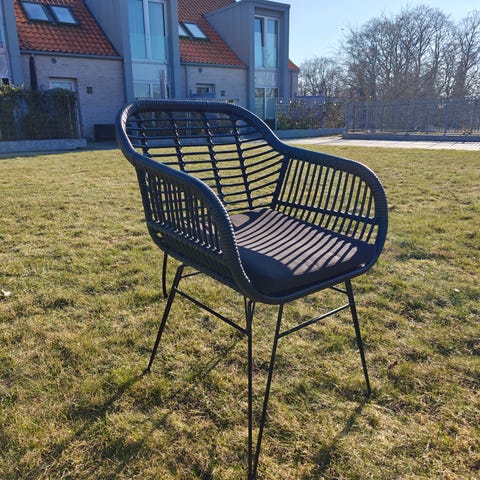Havestol i sort flet med armlæn og ben i metal. Sæde og ryg er udført i flettet plastmateriale, som er let at rengøre.