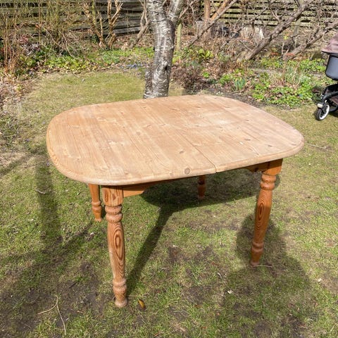Spisebord i massivt træ, formentlig fyrretræ, med rektangulær bordplade og drejede ben. Bordet har indbyggede skuffer på langsiden, som kan bruges til opbevaring af mindre genstande. Overfladen fremstår i en naturtræ-finish, hvor årer og knaster i træet er synlige. Velegnet som spisebord eller arbejdsbord i køkken, stue eller alrum.