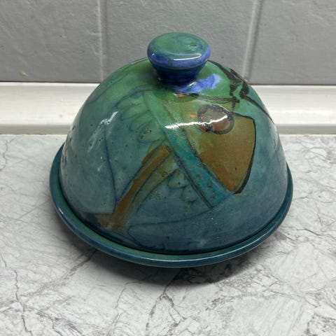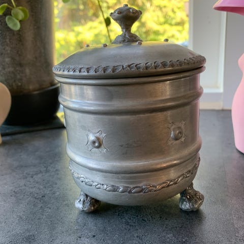 Tin løgkrukke med låg, Metropol Tin Kunst, Super sød tin løgkrukke med låg og lille perle fra Metropol tin kunst. Krukken er gammel og har patina.