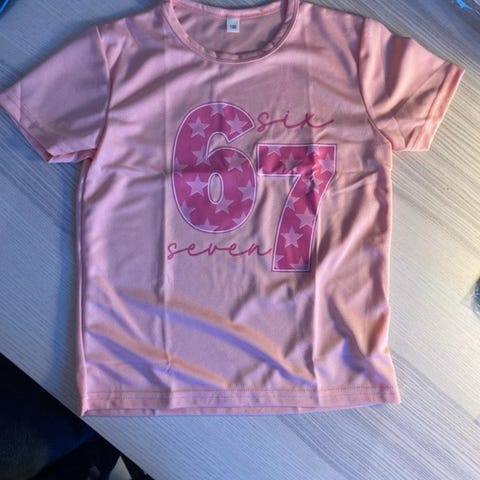 Børne t-shirt med stort front- og rygprint med teksten "Six Seven" og tallet 67 i blå nuancer. T-shirten er kortærmet og i multifarvede toner med mørk baggrund. Unisex model i one size til børn. Egnet som hverdagsbluse eller til sport og leg. Materialet fremstår som let og glat, velegnet til aktiv brug.