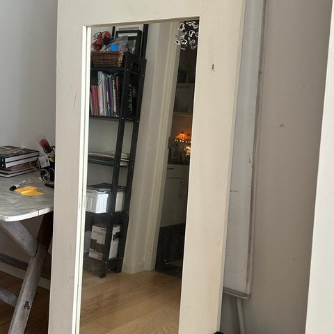 Spejl med hvid træramme. Enkelte ridser, som man ikke ser tydeligt. IKKE fra IKEA. Måler 180x78 cm.