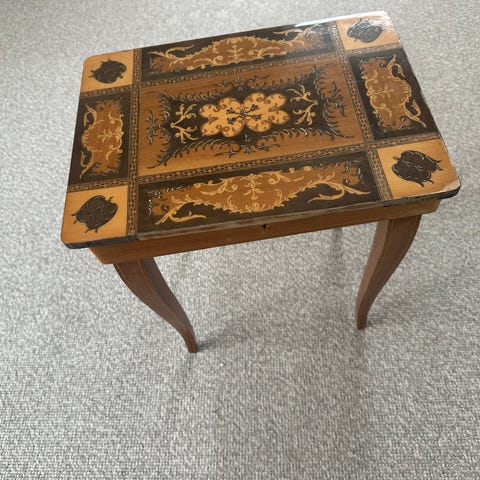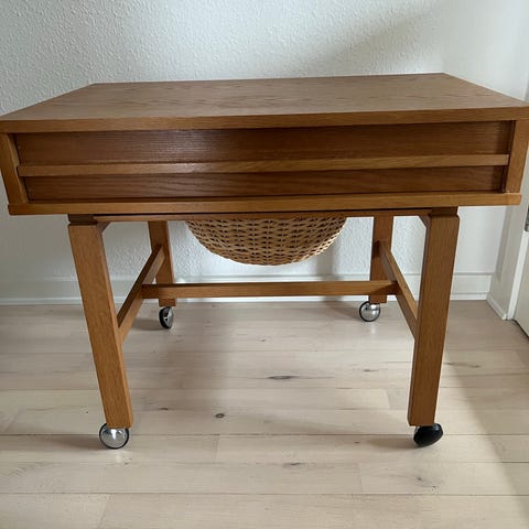 Sybord, Sybord med skuffe og flettet kurv. Sybord på hjul. Rullebord, sidebord, lille bord med opbevaring. H: 48, l: 63, d: 44 cm. Brugt stand med diverse brugsmærker. En flig af håndtag på skuffen, træ flig er i skuffe, kan limes på. Træet trænger til olie. Afhentes 8570 Trustrup på Djursland