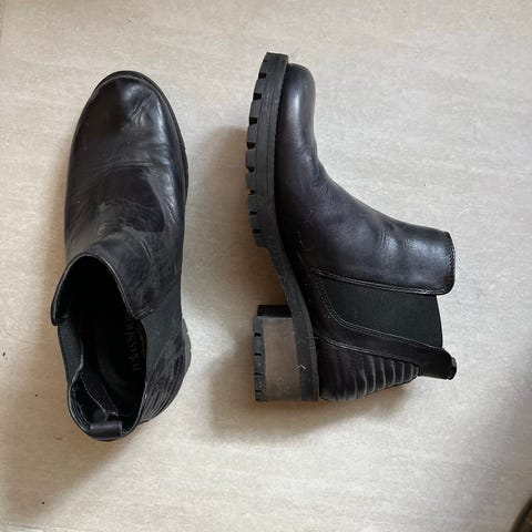 Vagabond støvler i størrelse 39. Klassiske sorte ankelstøvler med elastik i siderne og trækstrop bagpå. Støvlerne har kraftig ydersål med mønster for bedre fodfæste. Indersålen er let polstret for øget komfort. Velegnet til hverdagsbrug i efterår og vinter.