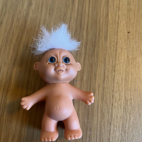 Trolledukke Dam med hvidt hår i grønne bukser